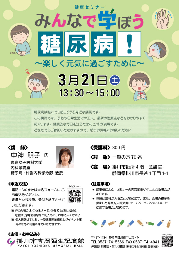 学び・体験EVENT イベント 募集中 健康セミナーみんなで学ぼう糖尿病!~楽しく元気に過ごすために~ 2026年3月21日(土) 糖尿病は誰にでも起こりうる身近な病気です。 今回の講演では、「みんなで学ぼう糖尿病!~楽しく元気に... 詳細はこちら 一覧はこちら 過去のイベント 第11回音楽会の日 2025年11月23日(日) いつもは4名で伺っているBABですが、今回は女子だけのJOBAB(女BAB)でお邪魔します! プロ... 詳細はこちら 秋のイベントデー 2025年10月25日(土) 生家案内、クイズラリー、バルーンアート、ヨーヨー釣り、救命救急体験など、当館ボランティアによるおもて... 詳細はこちら 一覧はこちら